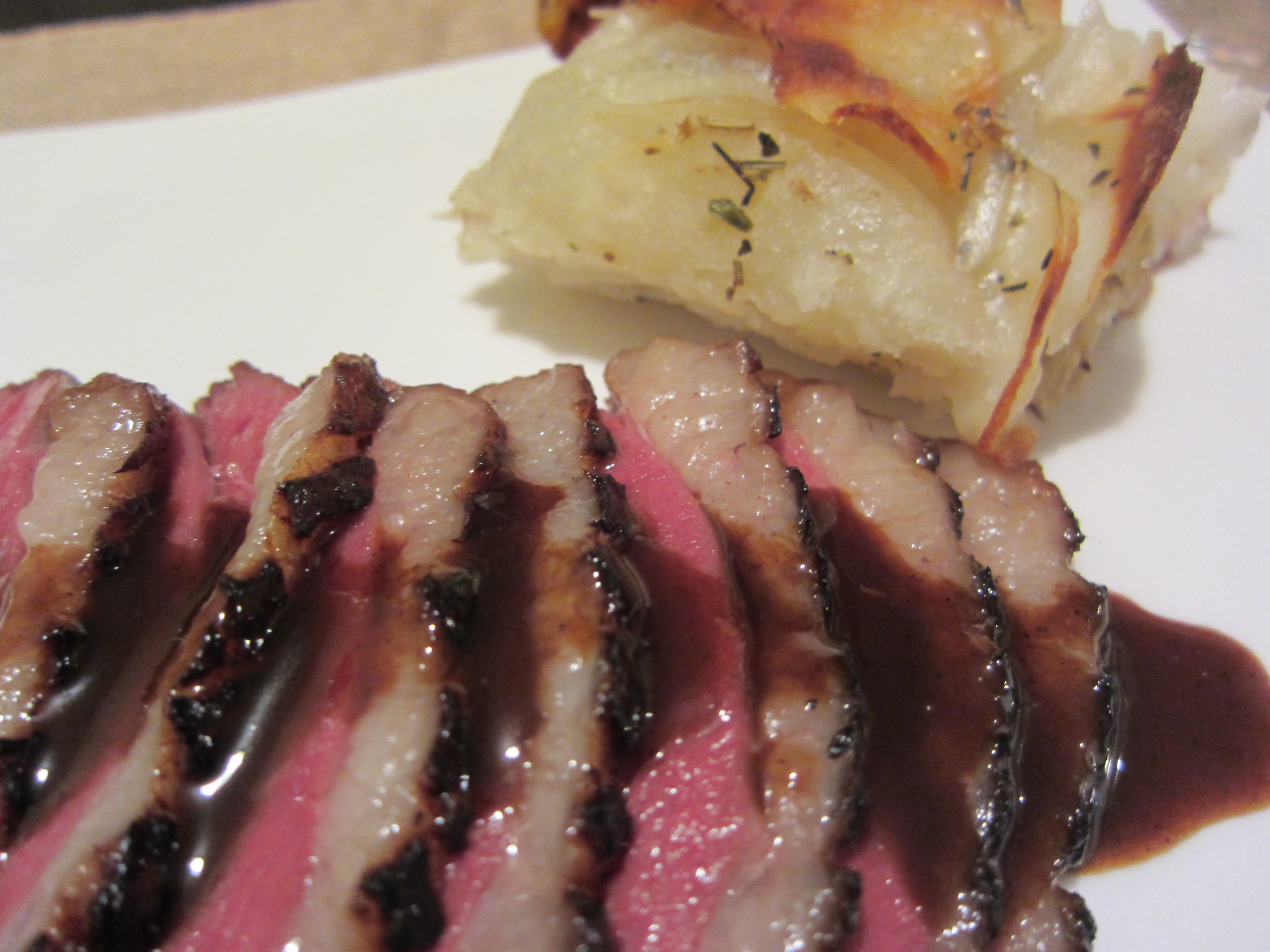 6)どのくらい焼くかは鴨の厚さや好みの焼き加減によるのですが、私はレア目のミディアムレアに仕上げることを目標に皮のほうを7分ほど焼き、一度ひっくり返して肉を二分焼き、最後にもう一度皮の方を1分間焼きました。最後にもう一度皮目を焼くには理由があるのです。フフフ。。。