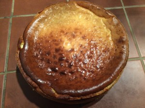 型を揺らしてみて、中央付近はまだふるふる震えるくらいでジャスト!ここでは竹串を刺したらまだ生焼けっぽい生地がついて来るくらいだと思います。でもそれでいい。中に入れたままでオーブンの火を止め、ゆっくりと余熱を入れます。