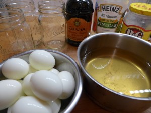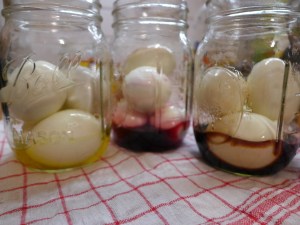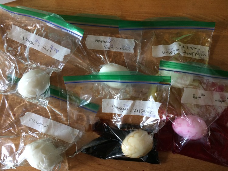 あとは好みの調味をしましょう。今回、私は瓶をみっつ用意して各4個の卵を入れ、各瓶にそれぞれバルサミコ酢、ビーツ缶詰の汁、バナナペッパーのピクルスの汁を大さじ3ずつ入れました。