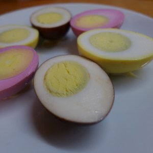 でもね、おいしく作ろうと思ったら作れるんじゃないかと思いました。強すぎる酸味を調整してなんらかの旨味を加えられればいいんじゃない?面白いほど着色できちゃう性質もあるし、目に楽しく仕込みが楽なパーティーのフィンガーフードになるんじゃないかしら?デビルドエッグ(ゆで卵を半分に切り黄身を取り除きマヨネーズなどと混ぜて白身にリターンするパーティーフードの定番)はおいしいけど、作る手間がかかるのと、作り置きがあまり効かないこと、それに作業の途中で黄身が道具や器に残って減ってしまうのが心苦しいんですよね。とくに美しく作ろうと絞り出し袋とか使うと顕著じゃないですか。その弱点を克服した温故知新な一品ができるんじゃないかしら?