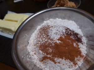 2) 次に粉類の用意をします。ボウルに小麦粉、ベーキングパウダー、ベーキングソーダ、各種スパイスを入れ、泡だて器でぐるぐると混ぜます。