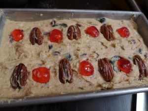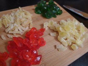 私は普段こうした着色料がガツンと攻めてくる食材はあんまり使わないのですが、このケーキには悪趣味の範疇に片足乗っちゃってるような色彩の豊かさが望ましいと判断しました。アメリカのトラディショナルなフルーツケーキにはこの色味は必須でしょ。くらいに。この際だから緑も入れてしまえ。クリスマスカラーだ。