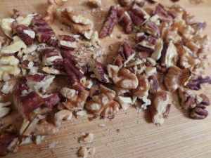 くるみとピーカンナッツは軽く乾煎りしてから大きめに刻みます。乾煎りするのはひと手間だけど、香りと歯ごたえがドンと向上するので私はこの手間は惜しまない。