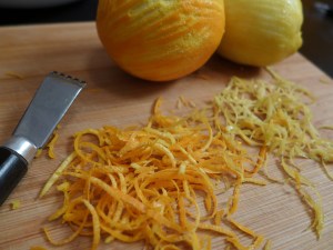 私の住む近所でレモンピール、オレンジピールのどちらも手に入らなかったのでここでは私は皮を薄くむいて使うことにしました。