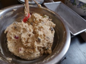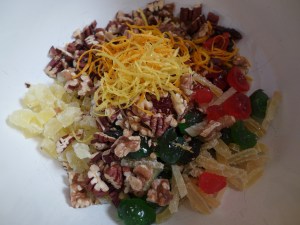 1) まずは中に入れる具の準備をします。ついラム酒に漬けたレーズンなどを使いたくなるところですが、直前の買い物リストに干しブドウとあるところを見るとあらかじめ漬けたりはしてないみたいなのでレーズンは下準備なしでそのまま使っちゃいます。