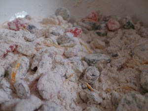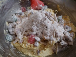 6) 2)の粉類と1)で用意した具を混ぜます。具材が粉をまとうのでまんべんなく生地に混ざるし具が沈むこともなくなります。