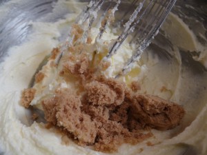 柔らかくしたバターを泡だて器で混ぜ、数回に分けて砂糖を加え、都度よくかき混ぜます。