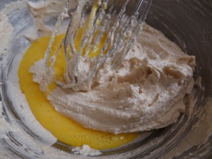 たいていのバターケーキのレシピでは卵を一個ずつ入れろと書いてあって、かつベーキングパウダーとベーキングソーダの両方の膨張剤を使います。これで膨らみを出すんですね。