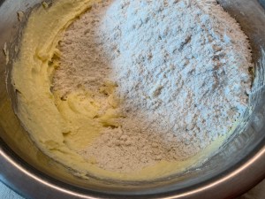 1)アーモンドパウダーと小麦粉、塩を混ぜておきます。振るってもアーモンドの粒が残ったりしてしまうので、ボウルに入れて泡だて器で混ぜたらよし。