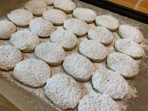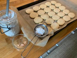 7)焼きあがったら、温かいうちに粉砂糖を振りかけます。壊れやすいので気を付けて。