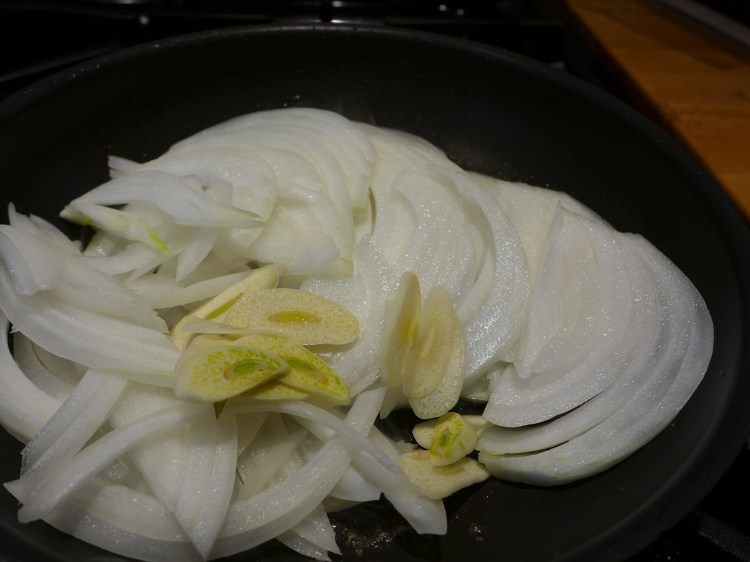 2)玉ねぎ、にんにくを薄切りにし、フライパンを中火にかけてバターを大さじ1ほど使って炒めます。
