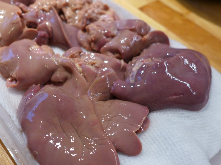 1)鶏レバーをたっぷりの冷水にしばらく入れておきます。途中、何度か水を替えます。
