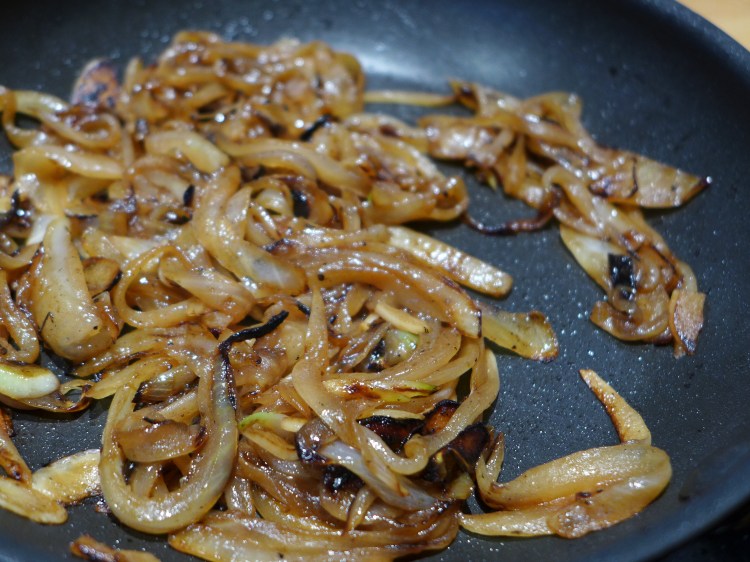 4)玉ねぎが一部カラメライズして濃い飴色になったら別の器に取り出します。