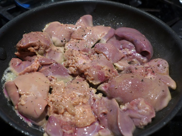 6)フライパンを中火にかけてバター大さじ1をとかし、レバーを焼きます。