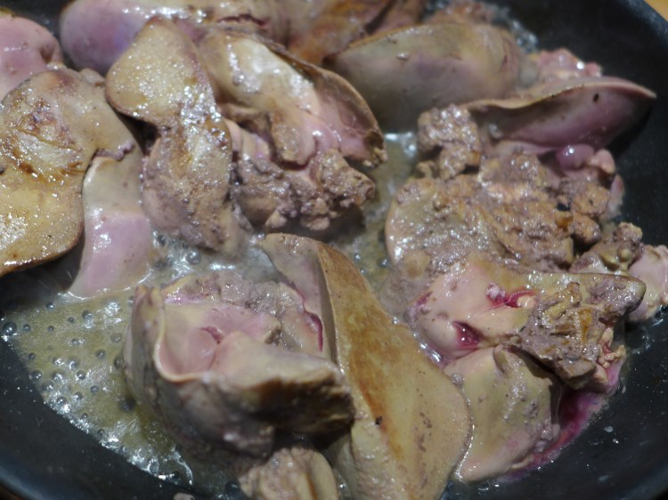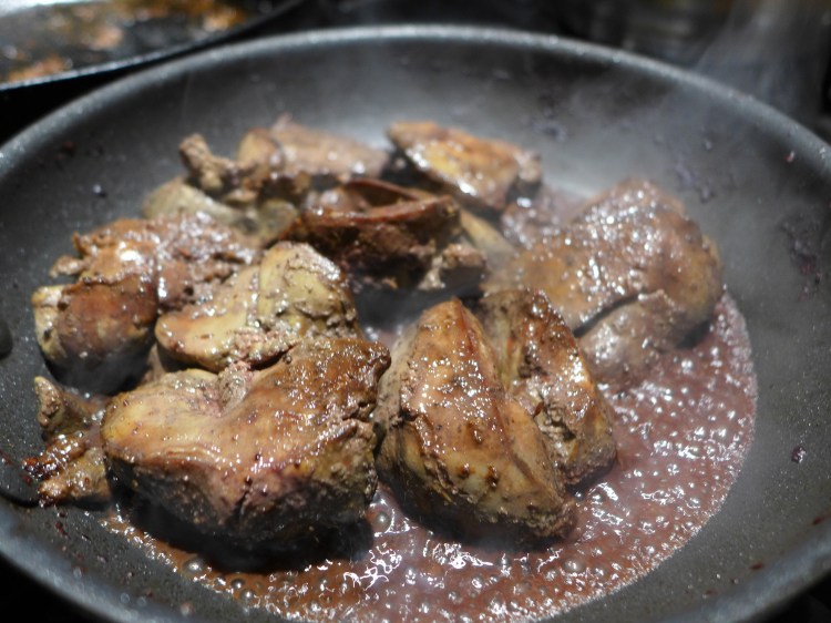 7)レバーにすっかり火が通ったら赤ワインを入れ、鍋底をヘラでこすってデグラッセし、火を止めます。