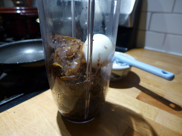 8)ブレンダーに4)の玉ねぎ、ゆで卵、6)のレバーおよびその鍋に残ったワインのすべてを入れます。