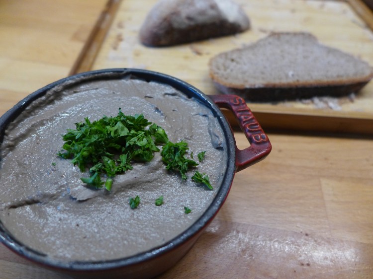 9)塩こしょう、少々のナツメグで味を調えたら器に移し、冷蔵庫で半日ほど落ち着かせます。この時にかなりゆるい感じでも、冷めると固くなりますのでナイフですくってパンにぬぐって食べるのに良いくらいになるでしょう。