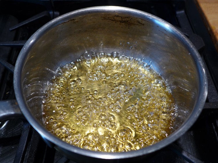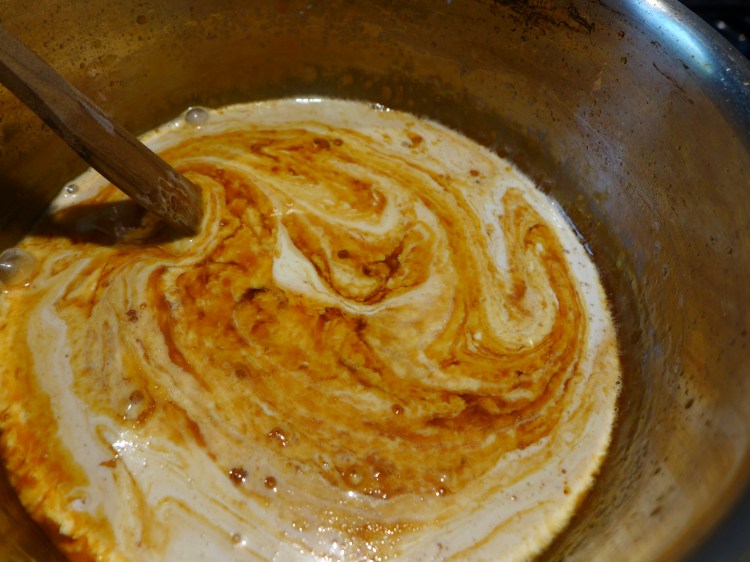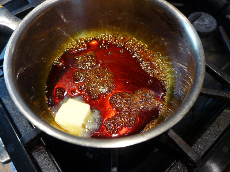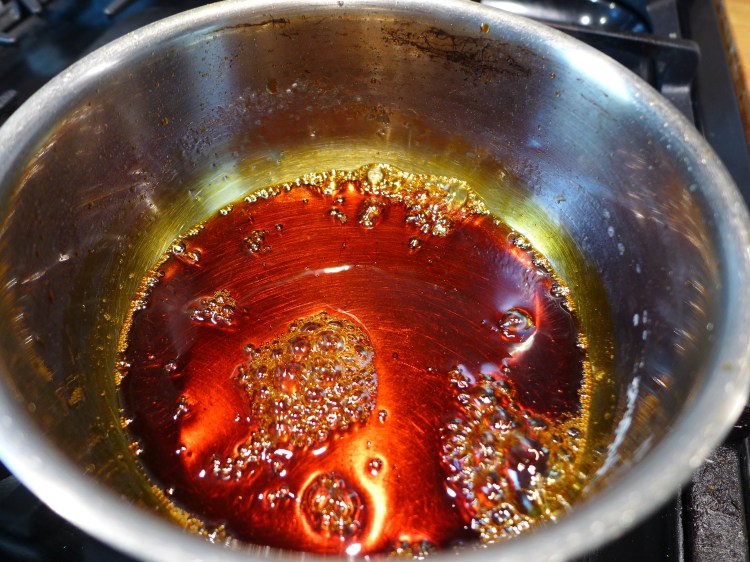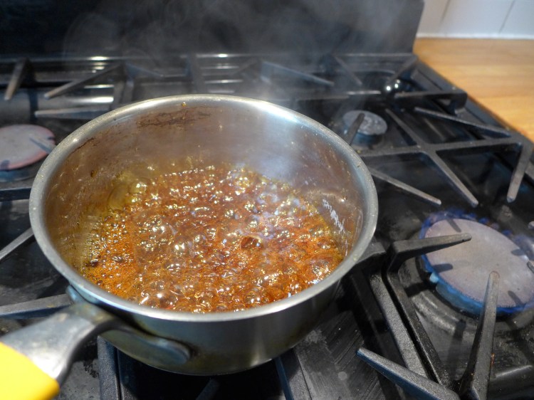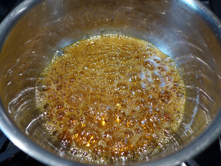 色づいてきた・・・砂糖ってほんと変化が魔法みたいですよね。甘さも甘さだけど、色彩とかツヤとかの視覚的な変化も魅惑的だし、なんでこんないい匂いさせられるんだろう。人たらしのためにできた危険な物質・・・もう降参した方が楽になるよ。