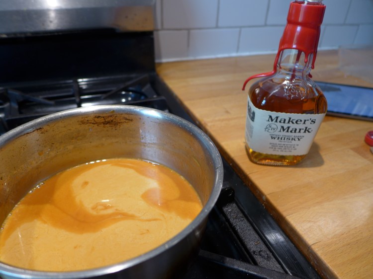 4)無駄口をたたいてしまいましたが、最後にウイスキーを加えて混ぜ、火を止めます。レシピのタイトルにはバーボンと書いてしまいましたが別にライウイスキーでもいいし、むしろラム酒でもいいんじゃないかしら。