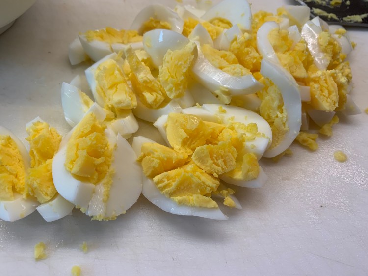 ざっくざっくと適当に刻みます。ゆで卵の白と黄色ってほんとに優しくて華やかでかわいい。好き!ゼロポイントだし!