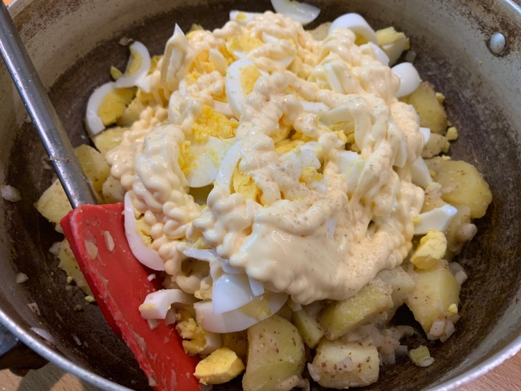 8)おろしにんにくを混ぜられたマヨネーズを、大きくヘラを使ってじゃがいもに混ぜ合わせます。最後には味見をして、塩こしょう、さらなるマヨネーズで味を調えてください。使用するアンチョビによって塩気はかなり違ってくると思います。