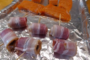 3)それをベーコンでくるくる撒いて、爪楊枝でとめます。