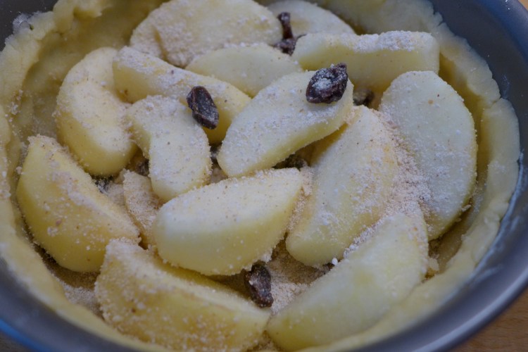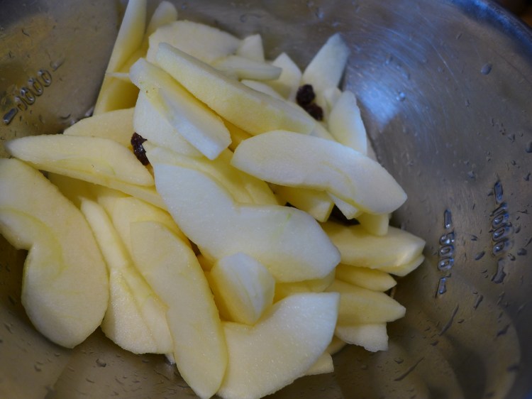 すべてのリンゴを薄切りにしたところでレーズンを加え、砂糖大さじ1を振りかけてざっと混ぜます。
