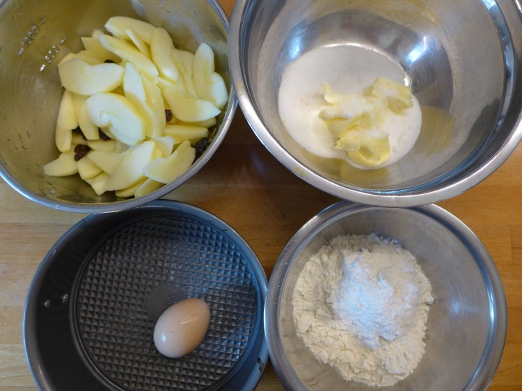 写真ではすでに小麦粉、ベーキングパウダー、塩をひとつのボウルに入れちゃってます。バターと砂糖ももう一緒になってます。あとリンゴはすでに切って(以下略・・いや以下詳細!)。