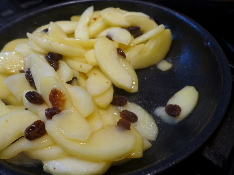 できるだけ水を出さずに仕上げたいので、テフロンのフライパンなど広い面積の鍋を使うと良いと思います。2)のリンゴとレーズンをすべて鍋に入れ、強めの中火程度の火加減で手早く炒める感じで扱います。弱火でくつくつ煮たり煮崩してしまったりしないように。