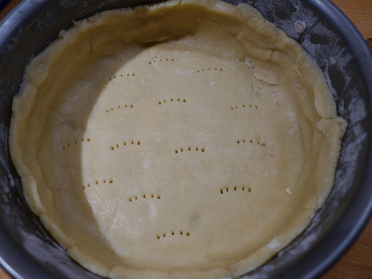 10)伸ばした生地を型に入れ、底を押さえたら側面に這い上がらせるように伸ばしつつ押し付けていきます。