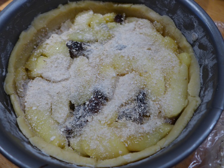 12)型の底にパン粉を大さじ1ほど振り撒いてから4)のリンゴを入れます。これはパン粉にリンゴの水分を吸わせて、生地がベッチョリすることを防ぐ目的です。リンゴを平らにならした後も、残りのパン粉おおさじ1を振りかけましょう。